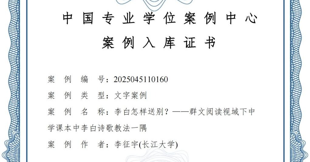 近日,全国教育专业学位研究生教育指导委员会公布了第六届教育专业学位教学案例征集工作评审结果(教育发便字〔2024〕18号),我校李征宇教授的“李白怎样送别?——群文阅读视域下中学课本中李白诗歌教法一隅”通过评审,该教学案例正式被教育部学位与研究生教育发展中心入库。第六届教育专业学位教学案例征集工作由全国教育专业学位研究生教育指导委员会组织开展,共收到全国123个单位提交的808篇教学案例,最终有229篇教学案...