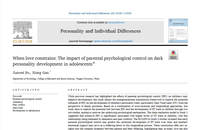 2025.09.15近日,长江大学教育与体育学院甘雄博士及其研究生团队在国际权威期刊《Personality and Individual Differences》与《Research on Child and Adolescent Psychopathology》先后发表了题为When love constrains: The impact of parental psychological control on dark personality development in adolescents和Through a Dark Lens: A Longitudinal Study on Dark Triad Traits, Future Negative Insight, and Antisocial Atti...