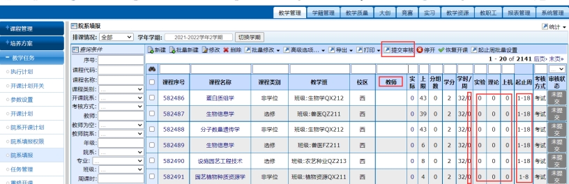 ⑷提交审核。任务填报中的教师、学分、周学时、总学时、理论学时、实验学时、上机学时、起止周(系统默认1-18周要修改)等信息是排课重要依据,请务必填写完整。完成院系填报后-勾选-提交审核。图四
