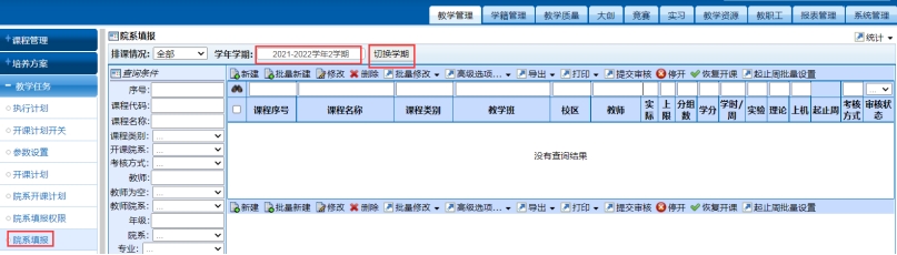 作为开课单位,对内,本单位所有专业2021-2学期应开课计划是否齐全,对外,为其他单位开设课程,涉及的专业是否齐全,在院系开课计划查看;班级是否齐全,在院系填报查看。(图二)