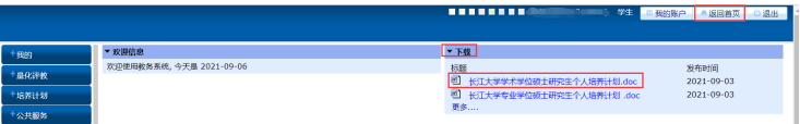 1、返回教务系统首页,根据不同类型(博士、学术学位硕士、专业学位硕士)下载个人计划模板。个人培养计划模板共四部分内容,分别是封面、课程安排、研究环节和学位论文工作。个人培养计划中的封面、研究环节和学位论文工作等三部分内容通过下载模板填写。课程安排在教务管理系统制定,提交审核通过后,在线打印。见图十五