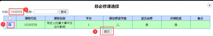④点选课-输入课程代码(课程代码一定要与专业培养方案的课程代码保持一致。)-查询课程-勾选课程-点提交-达到课程组最低学分要求(见图三)后点”完成“。(见图四-图六)再进行下一个课程组的选课。