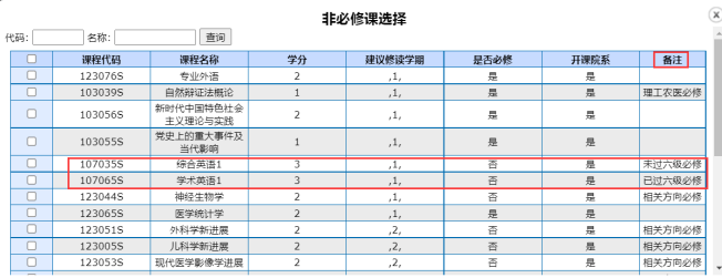 ▲选择课程时注意查看“备注”中说明。见图七