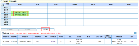 我的-选课-点击进入选课-输入课程代码-点击望远镜-点击选课(选择本人所在班级的任务)-是否提交-根据情况选择是或否-选择是显示选课成功-课程选择成功后在已选课程-且显示上课时间。见图四至图七。
