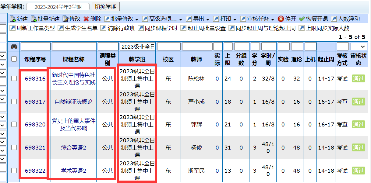 3、2023级申请集中授课的非全日制硕士研究生(名单见附件),通过查询图中课程序号进行公共课程的选课。