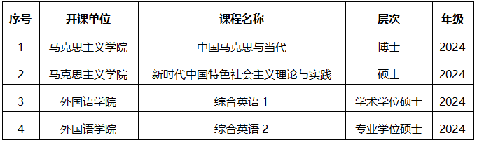中国马克思与当代、新时代中国特色社会主义理论与实践、综合英语1、综合英语4门公共课程纳入全校研究生统考安排(见下表)。