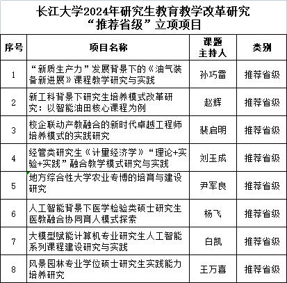 经个人申报、学院评选推荐、专家评审,研究生院评议,我校评选出2024年研究生教育教学改革研究“推荐省级”项目8项。《“新质生产力”发展背景下的<油气装备新进展>课程教学研究与实践》等8项研究生教改项目将由学校推荐至省教育厅。其他校级研究生教育教学改革研究项目待后期公示。
