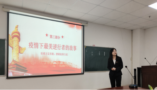 宣讲伊始,马文琴同学以“去年这个时候你在哪里,在干什么?”的问题形式将大家的思绪拉回到不平凡的2020年。紧接着,她带大家一起回顾了习近平总书记2021年的新年贺词,道出中国人民患难与共的担当和守望相助的胸怀;通过播放视频《百炼成刚·党史上的今天》,她阐述了当代青年向上和向善的人生姿态和价值追求:在工作上“向上”,忠于职守;在学习上“向上”,刻苦钻研;在生活上“向上”,艰苦奋斗;在理想信念上“向善”,匹夫有责; 在价值取向上“向善”,大爱无疆; 在人际关系上“向善”, 助人为乐,和大家一起重温“雷锋精神”。通过讲述疫情下最美逆行者甘如意千里走单骑的事迹和自己投身社区抗疫一线的故事,表达着人间的真善美。最后,马文琴同学还分享了长大学子的战“疫”故事,让大家感受到了身边自有真情在,人间相助处处暖。