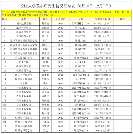 根据年度工作计划,为了让学校疫情常态化防控工作顺利进行,各学院报送了2022年秋季学期发热就医研究生信息,经学院核实、研究生工作部思想政治教育办公室审核,研究生工作部研究决定,拟向刘雪凌等26名研究生发放发热就医补助,补助标准为220元/人,现将名单在全校范围内予以公示。