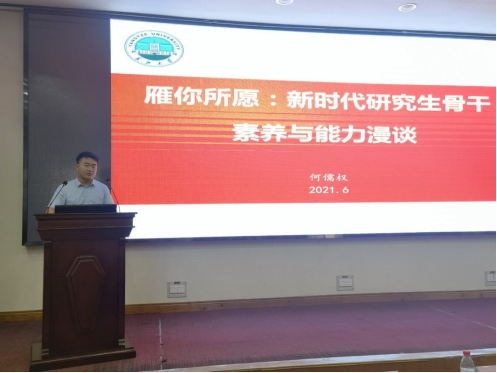 “何为头雁?何又为领雁?如何去做领头雁?”城市建设学院辅导员何儒权以“雁你所愿:研究生骨干的素养与能力”为主题,阐述了作为一名研究生骨干应该具备的基本素养与能力,要做好服务引领,在研究生群体中发挥带头作用。