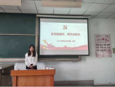 会议伊始,黄盟同学通过短片回顾了党带领人民筚路蓝缕完成独立富强的奋斗之路,鼓励生逢盛世的青年一代传承红色精神,汲取优秀经验,在实现中华民族伟大复兴的新征程上披荆斩棘。紧接着,她以四个耳熟能详的事例,展现出当代青年将个人理想融入社会理想,心怀感恩地汇入时代洪流的风采。最后她呼吁,站于崭新的历史节点,青年一代应用年轻朝气的蒸蒸力量,勇往直前的进取精神,挥洒青春之色彩,浸染使命之宏图,绽放璀璨之光华。