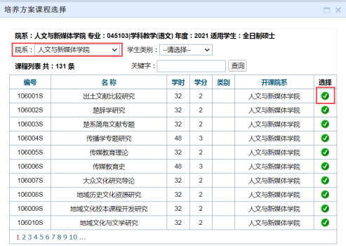 步骤图示:点击第二个编辑图标-点击批量添加-选择院系-点击课程右侧绿色对勾-课程选定成功。此面可翻页。见图三-五