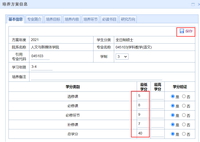 步骤图示:培养-培养方案管理-全日制硕培养方案-方案年度(选择2021)-院系-专业类型(学术型、专业型)-查询-点击第一个小图标-填写学制为3-填写最低学分-点选学分验证为“是”-保存。见图一、图二