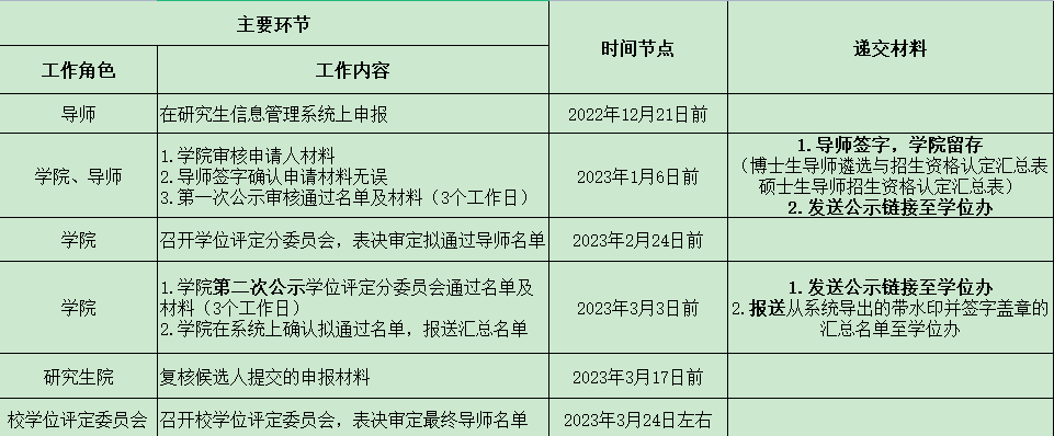 2023年33日前,博士生导师由博士学位点依托学院(部)公示博导遴选与认定材料,硕士生导师由所在学院公示硕士生导师招生资格材料,公示期不少于3日。公示结束后,学院在研究生管理系统上确认拟通过导师遴选与认定名单,将导出的带水印签字盖章汇总名单(包括博士生导师认定与遴选名单、硕士生导师认定名单)报送研究生院学位办。